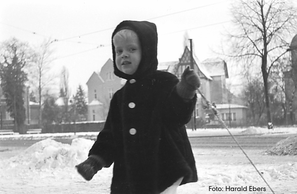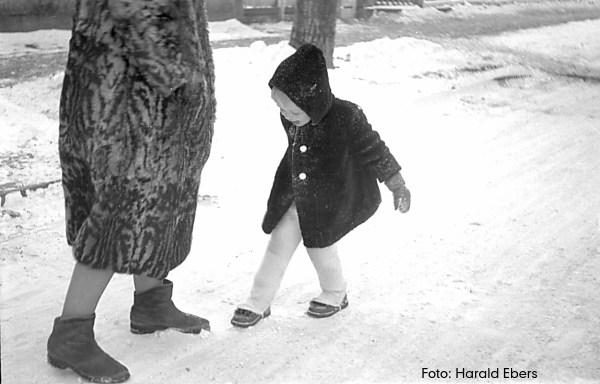Meine Großmutter jedoch wischte die Bedenken beiseite, nahm mich an die Hand und wir traten aus dem Haus. Eine weiße Decke lag auf den Sträuchern, die Bäume im Vorgarten waren ebenfalls mit Schnee überzuckert. Auf dem Bürgersteig hatte man den Schnee zu Hügeln zusammengeschoben. Als ich morgens im warmen Bett wach wurde, hörte ich das Schaben und Kratzen der Schneeschippen. Wohlig streckte ich mich noch einmal aus. Jetzt bereitete es mir Freude mit meinen Alltagsschuhen gelegentlich in einen Schneehaufen zu treten und mich über die tiefen Spuren darin zu freuen. Die Welt sah viel feierlicher aus. Die Stromabnehmer der Straßenbahn sprühten blaue Funken und auf den nicht geräumten Wegen in den Seitenstraßen sah man frische Spuren von uns, die wir hinterlassen hatten. Die Luft war kalt, hinterließ ein kratziges Gefühl im Hals. Aus den Schornsteinen quollen dichte Rauchwolken manchmal gelblich, oder wieder schwärzlich. Das kannte ich, wenn wir morgens die Öfen anheizten und manchmal etwas Rauch aus der Ofentür ins Zimmer trat. Schnell passierten wir den Baum, wo mein Großonkel uns so unsanft zum Stehen gebracht hatte. Links war eine riesige Kohlenhandlung mit einem Förderband, abgelöst von einer Bauschlosserei und dahinter befanden sich schon die Bahngleise. Man konnte die Züge hören, aber durch die Bauten war der Blick dahin verstellt. Auf einer Baracke thronte eine Luftschutzsirene aus dem zweiten Weltkrieg. Sie diente als Signal für das Schichtende und wenn sie so schaurig zu heulen begann, dann musste ich an die vielen Erzählungen denken, die in meiner Familie kursierten, wo irgendjemand ausgebombt, verschüttet oder umgekommen war. Ich hasste das Geheul und war heilfroh, wenn wir sie hinter uns gebracht hatten. Dann kam der Bahnhofsvorplatz, ein breiter Platz mit Fachwerkbauten ringsum. Das Bahnhofsgebäude mit imposantem Turm aus gelben Klinker schloss den Platz ab. Ich liebte dieses Ensemble. Es machte einen so gemütlichen Eindruck im Gegensatz zu den lauten, verkehrsreichen Straßen, den endlosen Häuserreihen, den kleinen abgezirkelten Rasenflächen mit Gesträuch umrandet und es war strengstens verboten den Rasen zu betreten. Aber dieser Bahnhof mit kleinen verschiedenen Geschäften und dem „U“ aus Fachwerkhäusern, dem Halteplatz für Taxen - das war für mich eine abgeschlossene Welt, die gar nicht zu dieser Großstadt zu gehören schien. Es passte eher zu der Landschaft in Schleswig-Holstein, wo Großmutter mich zum ersten Mal aus Berlin zu Verwandten mitnahm.