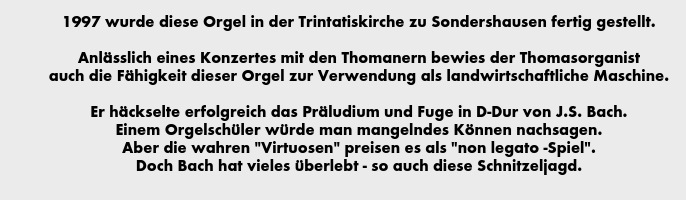 Selbstverständlich habe ich über 40 Jahre als nebenamtlicher Kirchenmusiker nicht nur Trauerfeiern begleitet. Die nie enden wollenden Klagen alter Schachteln und Pantoffelhelden, die sich im Kirchenvorstand als die großen Kenner und Macher präsentierten, das ewige Geseire von Pastores, die das Evangelium für sich gepachtet haben, Unmengen von saumäßigen Predigten, das übliche Kirchenmusikerleid habe ich erlebt, wofür ich schließlich Rache nahm. Die Ergebnisse finden sich in meinen Texten immer wieder. Die schönste Anerkennung wäre es für mich, wenn der Leser sagt:“Also die da, das könnte doch das Fräulein von Connewitz sein, oder typisch Pastor Leiermann...“