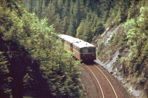 ![]() Triebwageneinheit VT98 als Standardzug auf der Strecke Goslar-Langelsheim-Clausthal-Zellerfeld-Altenau bei der Fahrt durch die "Schlucht". Der Bergeinschnitt vom Hellerthal-Viadukt bis zum Bf. Altenau wurde so genannt. (Sommer 1968) Exa IA, ORWO UT15, Tele-Ennalyt 2.8/135mm |