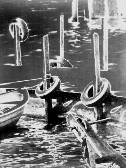 Teleobjektiven das Risiko zur Verwacklung. Trotz der Kritik entschloss ich mich das Foto zu vergrößern. Die Lehrzeit war durch den Umzug von Berlin in den Oberharz abgeschlossen worden und im Schullabor arbeitete ich mit einem anderen Schüler an unsern Werken. So lag nun mein Bootsanleger in der Entwicklerschale und quälte sich zu stärkeren Kontrasten, weil die Belichtungszeit offenbar zu kurz war. Durch ein Missgeschick von uns beiden bei der Fußbodenprojektion für ein besonders großes Foto kippte der Vergrößerer um und landete auf dem Boden. Erschrocken knipste einer von uns das Licht an, um zu schauen was passiert war. Ich nahm die Lampenhaube ab und prüfte die Lampe. Sie war intakt geblieben. Erleichtert setzten wir den Apparat auf den Tisch und ich schaute in die Schale. So war mit einem Mal das linke Foto dabei herausgekommen. Eine klassische Pseudosolariation, wie mir mein Lehrer es beigebracht hatte. Bisher hatte ich nur Misserfolg - aber nun war ich entschädigt. Das Original befindet sich im Familienbesitz, deshalb fertigte ich ein Repro auf Rollfilm an. Entwickelt wurde das Original im klassischen "Eukobrom"-Positiventwickler von Tetenal. Die sogenannte "Nachbelichtungstechnik" ist für Dia-Umkehrfilme zwingende Voraussetzung. Die Solarisation, wie sie in Bildbearbeitungsprogrammen für Digitalfotografie angeboten wird, ist eine rein rechnerischer Prozess, also ein Algorithmus. Die Pseudosolarisation dagegen beruht auf dem Sabatier-Effekt. Die Konzentration an Silberkristallen, die durch die reduzierende Entwicklung den entsprechenden Grauton erzeugt wird, erfährt durch die Nachbelichtung einer dramatische Steigerung. Es entstehen Kristallaggregate, während an den Übergangsstellen die Konzentration abnimmt und nach dem Fixieren weiße Flächen entstehen. Deutlich ist das an den Kanten zu sehen.Da chemische Reaktionen in fest-flüssigen Systemen durch die statistischen Molekularbewegungen gesteuert werden, ist jedes Bild, welches auf diese Art und Weise entsteht ein Unikat. |