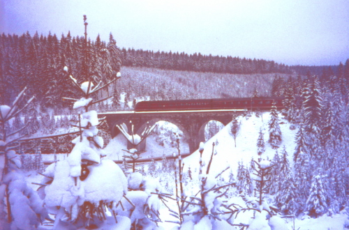 ![]() Die Bahnlinie (Goslar)-Langelsheim - Altenau besaß einen imposanten Viadukt, den gerade ein VT08 aus Braunschweig kommend überquert. Trotz Farbkorrektur zeigt der Ferrania-Umkehrfilme einen herben Blaustich. Schade, denn dieses Motiv wird sich nie wiederholen. 1976 wurde die Strecke stillgelegt und danach unmittelbar mit dem Abriss begonnen. Der Bundesbahn konnte es bei den Streckenstillegungen gar nicht schnell genug vorangehen. Dieser perversen Strategie verdanken die ländlichen Gegenden heute ihre Isolation und gleichzeitige automobile Zwangskultur. |