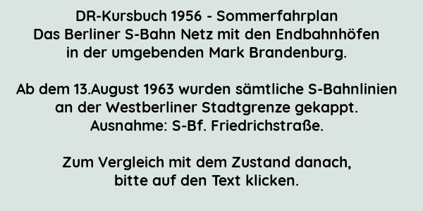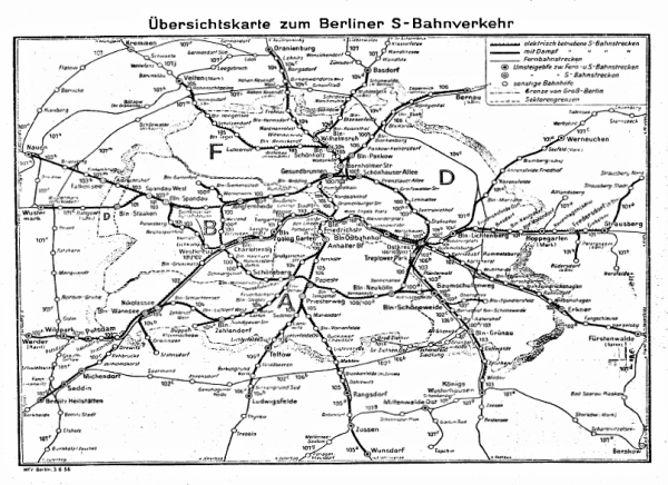 Langsam schlossen sich die Grenzen um Berlin. Im DR-Kursbuch des Jahres 1951 ist noch die Strecke Wannsee-Belzig neben anderen Lokalbahnen, die von den S-Bahn Endhaltebahnhöfen in die DDR fuhren, verzeichnet. In der Ausgabe von 1956 blieben lediglich zwei Strecken vom Westberliner Bahnhof Wilhelmsruh nach Basdorf und vom Bahnhof Staaken in Richtung Wustermark bestehen. Natürlich begannen und endeten die S-Bahn Linien noch sehr oft in der DDR. Für den Berufsverkehr war dies unerlässlich. So betrug die Fahrzeit durch Westberlin für einen Werktätigen aus Potsdam, der in der Umgebung am Alexanderplatz arbeitete knapp eine Stunde. Hätte er die Umgehungsstrecke benutzen müssen, so wäre er im Jahr 1956 zwei Stunden unterwegs gewesen. In den Siebziger Jahren verkürzte sich die Fahrzeit auf eine Stunde. Ferner gab es erstaunlich viele Bürger Westberlins, die in Ostberlin arbeiteten und sogar nach dem 13. August dort weiter arbeiten sollten. Zum 20. Jahrestag der DDR waren es auch Architekten aus West-Berlin, die entsprechende Geschäftsbauten rund um den Alexanderplatz errichteten. Es wurde allerdings nie der Öffentlichkeit kundgegeben, denn ab dem 13. August herrschte in Westberlin innerhalb der Bevölkerung eine Kriegstüchtigkeit, die heute von den Volksparteien so dringend gewünscht wird. Mit dem Abriegeln der Grenze wurden auch die S-Bahn Linien gekürzt und es gab nur einen Bahnhof in Berlin, den Bahnhof Friedrichstraße, der neben einem Fernbahnsteig für die „Interzonenzüge“ und einen Bahnsteig für die Westlinien nach Wannsee oder Spandau-West besaß. Hinter dickem Riffelglas sah man die Ostberliner S-bahn auf den ehemals dritten Bahnsteig ankommen und abfahren, man hörte die Lautsprecheransagen, aber kein direkter Sichtkontakt zu den Reisenden war möglich. Obwohl die Trizone und die SBZ im Jahre 1949 offiziell abgeschafft waren, natürlich mit Ausnahme der Sektorenstadt Berlin, wurden bis zur Wende diese Züge „Interzonenzüge“ genannt, die vom Betriebswerk Rummelsburg, bzw. von Saßnitz oder Warschau kommend, oder in der entsprechenden Gegenrichtung, weiter in den Westen fuhren. Konsequenterweise hätten deshalb die S-Bahnlinien, mit Ausnahme der westlichen Kurzstrecken von Jungfernheide bis Gartenfeld und Zehlendorf nach Düppel-Kleinmachnow, als „Intersektorenbahnen“ bezeichnet werden müssen. Doch in dieser geschichtlichen Epoche genoss Rationalität in politischen Fragen kein Ansehen, im Gegenteil, man machte sich verdächtig, wenn jemand von den offiziellen Sprachregelungen abwich. Statt „Demokratie durch das Volk“ hieß es „Diktatur der Propaganda“. Letztere hat sich anscheinend bis heute als Staatsräson erhalten. Die Fünfziger Jahre in West-Berlin gestalteten sich recht bunt durch eine Generation von Kriegskindern, die von elterlicher und staatlicher Gängelei die Schnauze voll hatte, jedoch innerlich diszipliniert ihre Freiheit zwischen Tütenlampen, Cocktailsesseln und Nierentischen in Bars, Tanzclubs und Jazzkellern auslebte. Wer etwas besser gestellt war legte sich eine „Vespa“, „Kreidler florett“ oder „NSU quickly“ zu und galt damit bei den entrüsteten älteren Leuten als „Halbstarker“. Ostberliner waren die armen Verwandten, die man halt duldete, man selbst fuhr nach Ost-Berlin um sich dort mit gewissen Luxusartikeln einzudecken, die spottbillig zu haben waren. Im Allgemeinen betrug der Wechselkurs D-Mark zu Mark der DDR 1 : 4, weshalb Kameras und Kamerazubehör sehr begehrt waren. Die Ostwährung erhielt man in sogenannten „Wechselstuben“, die meist an S-Bahn Bahnhöfen beheimatet waren. Die laschen Kontrollen an den Sektorengrenzen bargen kein großes Risiko dabei erwischt zu werden. Doch, wie war die politische Sichtweise in dieser Generation?