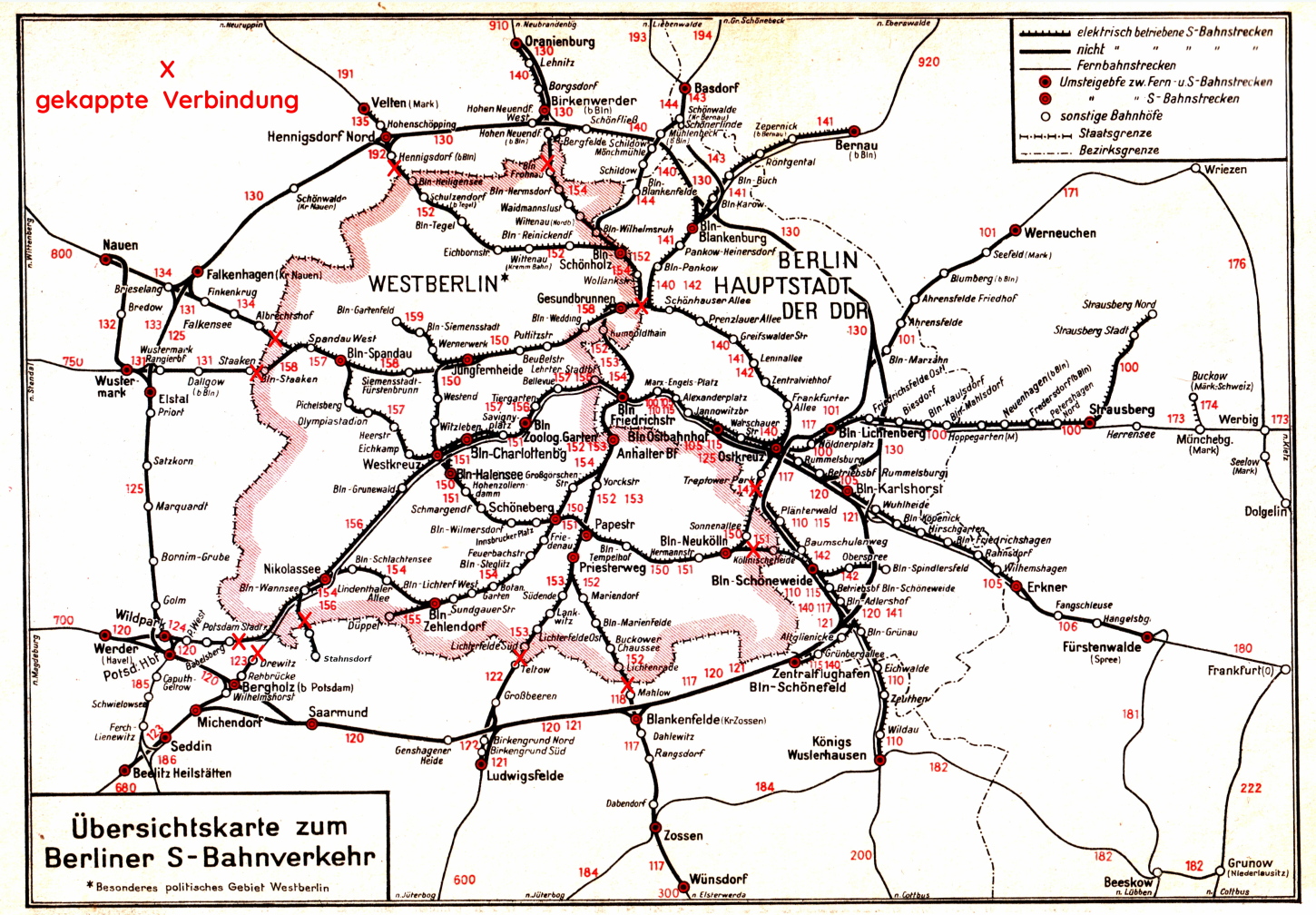 Liniennetz der Berliner S-Bahn ab 13. August 1961 - sämtliche Verbindungen in das Umland sind von West-Berlin gekappt worden
