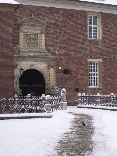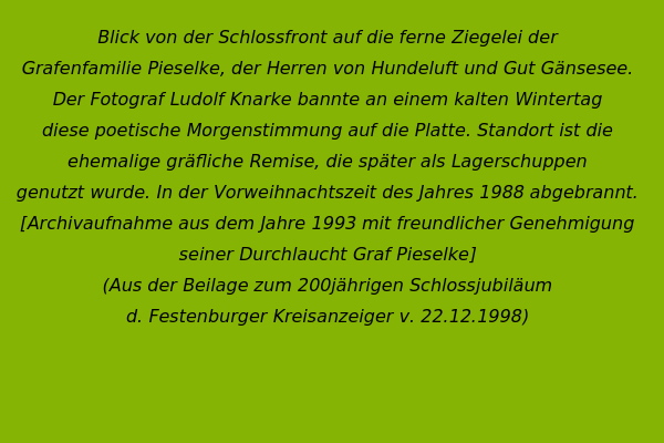 Blick vom Schlossturm zur Remise an einem Novemberabend des Jahres 1976