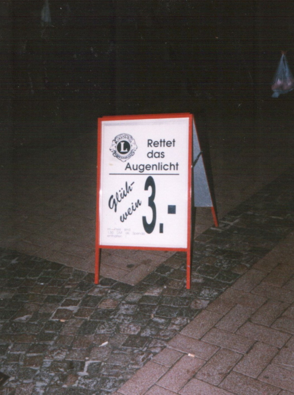der Adventsfeier in der Gemeinde. Der wohltätige Zweck zur Unterstützung sehbehinderter Mitbürger sollte die Streichung des Landesblindengeldes durch die Ministerin Frau vom Leiden (CDU), die Tochter des Landesfürsten Ernst Albrecht von Herrenhausen, etwas versüßen. Dabei blieb es zweifelhaft, ob der Aufruf als Warnhinweis gegen mögliche Methanolbeimischung gedacht war.