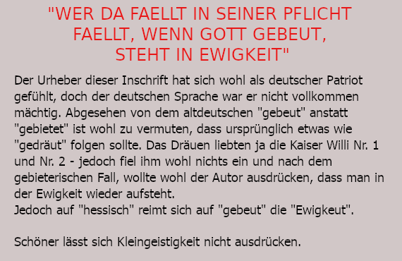 In jenem Krieg, der sich nach kurzer Zeit an den modernen Festungsbauwerken festbiss, der von seiner strategischen Planung, beginnend mit dem völkerrechtswidrigen Akt der Besetzung des neutralen Belgiens, nur auf ein kompliziertes Zusammenspiel aller Heeresgruppen setzte, waren Widrigkeiten nicht vorgesehen. Das friedliche Weihnachtsfest 1914, wo man den Sieg über den Erbfeind zu feiern gedachte, fiel aus und das Weihnachten 1918 konnte mit Krüppeln, Nervenkranken, Witwen und Halbwaisen bei schmaler Kost dann als das erste Friedensweihnachten wieder begangen werden. In der Zwischenzeit wurde im Schlamm gehaust, gefroren und gehungert, dann gestürmt, Giftgas eingeatmet, zerfetzt, gesprengt und geschossen für einen Geländegewinn in Verdun, den man in einer guten Stunde zu Fuß durchwandern kann. Die durchschnittliche Todesrate in Verdun betrug öfter tausend Mann pro Tag, was aber täuscht, denn das Massensterben fand nur bei Angriffen statt. Dennoch fanden sich bürgerlich dekadente Pennäler, die diesen Krieg verherrlichten und sich selbst durch diesen Krieg definierten, ja ihren Lebenssinn dort fanden. Ernst Jünger ist der bekannteste Kriegshetzer, doch seine Epigonen, die von den Nazis als gottbegnadete Schriftsteller gefeiert wurden, mischten ebenso tatkräftig in der Weimarer Republik mit, wenn es darum ging die Demokratie zu verunglimpfen und zu unterminieren.