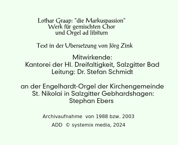 Ensembles: Tjalf Hoffmann (*1979), Violine & Tenor Matthias Spitzbarth (*1978), Violoncello, Orgel & Tenor Stephan Ebers (*1953), Orgel & Bass Georg Philipp Telemann Sonatine Nr. 1 G-Dur für Violine und Basso continuo Tjalf Hoffmann Violine, S. Ebers, Orgel St. Nikolai, Salzgitter-Gebhardshagen (1999) Karl-Friedrich Albes (1930 - 2019) Introitus & Psalm 27 Matthias Spitzbarth, Orgel & Tenor Tjalf Hoffmann, Tenor S. Ebers, Bass Klosterkirche Marienwerder, Hannover (1996) Alessandro Stradella (1642 - 1682) Sinfonia in a Tjalf Hoffmann, Violine Matthias Spitzbarth, Violoncello S. Ebers, Orgel Klosterkiche Marienwerder, Hannover (1996) |